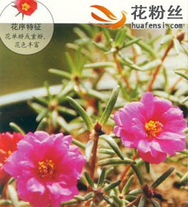 一年生肉质草本植物。株高10~15厘米。茎平卧或斜伸,紫红色,多分枝,节上丛生毛。叶散生或互生,细圆柱形,有时微弯,长1~2.5厘米,直径2~3毫米,顶端圆钝,无毛;叶柄极短或近无柄,叶腋常生一撮白色长柔毛。花顶生数朵簇生枝端,直径2.5~4厘米,日开夜闭,基部有叶状苞片8~9片,轮生,具白色长柔毛,单瓣,萼片2枚,淡黄绿色,卵状三角形,长5~7毫米,顶端急尖,多少具龙骨状凸起,两面无毛,花瓣5枚或重瓣,倒卵形,顶端微凹,长12~30毫米,有白、黄、红、紫等色,雄蕊多数,长5~8毫米,花丝紫色,基部合生,柱头5~9裂,线形。蒴果近椭圆形,盖裂;种子细小,圆肾形,有珍珠光泽,表面有小瘤状凸起。