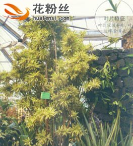 常绿灌木,株高可达9米。叶剑状披针形,无柄,革质富光泽,全缘,叶边缘金黄色。节问短,叶片密集。花序苹生或分枝,小花白色。