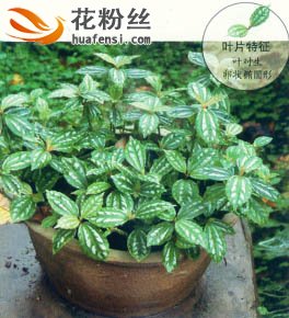 多年生常绿草本,株高15~40厘米。叶对生,卵状椭圆形。叶缘上部具疏钝锯齿。叶脉间有4条大小不同的银白色纵向宽条纹,叶背浅绿色,叶缘有浅齿。顶生聚伞花序,小花白色。