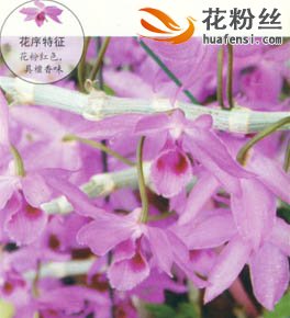 多年生附生植物,具假鳞茎,丛生,圆柱形,具节,株高可达50厘米或更高。叶披针形,花期无叶,在茎节上抽生花序,2~3朵为1束,花粉红色。具檀香味,故名。