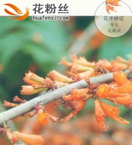 多年生常绿灌木,株高3—5米。叶对生,近革质,披针形或卵状披针形,顶端渐尖,基部圆形或心形。圆锥花序短聚伞状,萼筒花瓶状,鲜红色,花瓣小,淡黄色,线状披针形。